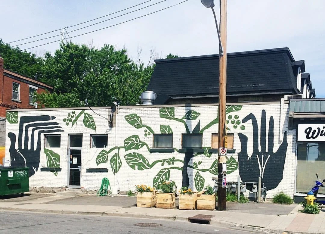 Mural created in 2016 in homage of coffee bean pickers; the mural sits on the corner of Bank and Arlington and has never been tagged or defaced.