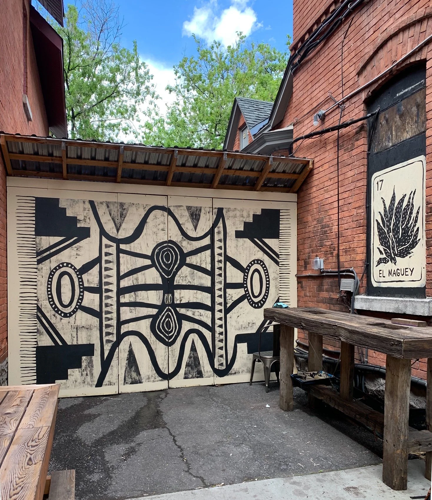 Mural abstraction of a rug and Loteria card on the right hand side window covering. Located on Somerset St., this mural was created in 2020 and remains on location and has never been defaced.